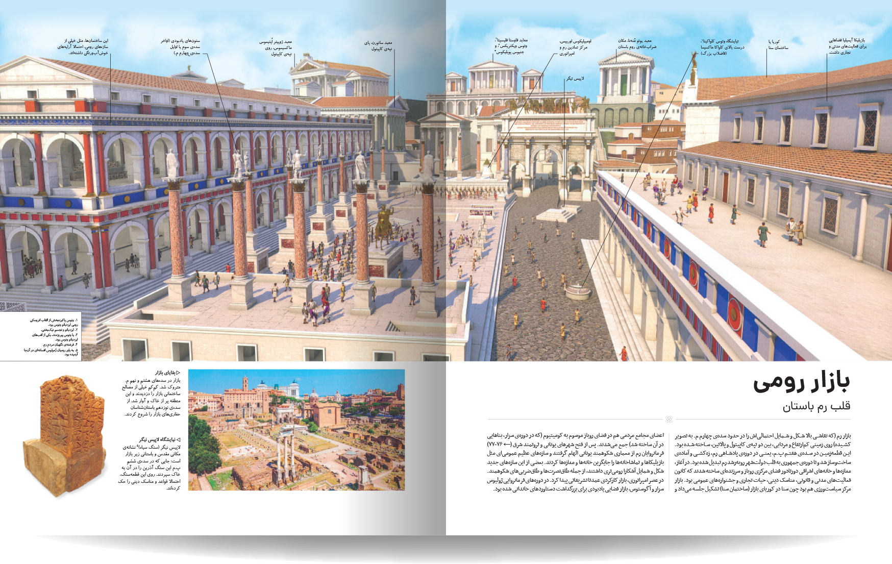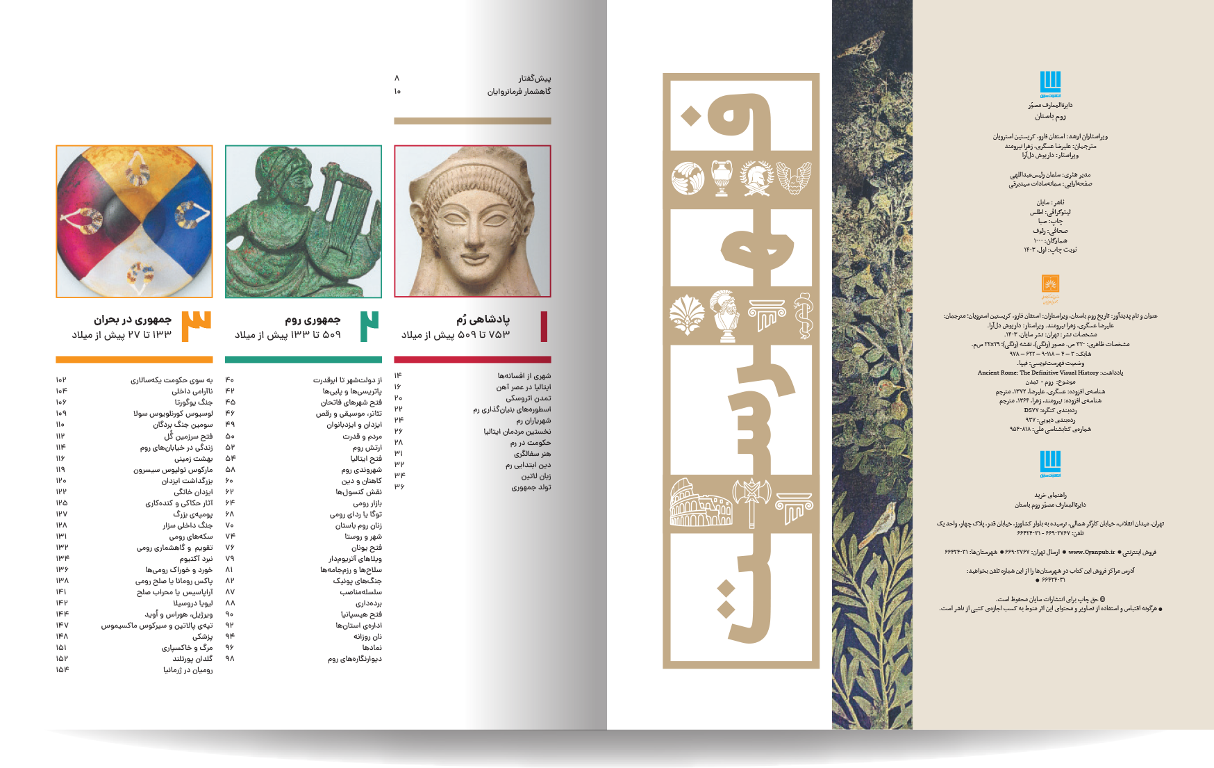 دایره المعارف مصور روم باستان، نوشته شده توسط جمعی از نویسندگان انتشارات دورلینگ کیندرزلی، یک اثر فوقالعاده و جامع در زمینه تاریخ روم باستان است. این کتاب با طراحی گرافیکی چشمنواز و عکسهای با کیفیت بالا، خوانندگان را به سفری شگفتانگیز در دنیای پر طمطراق امپراتوری روم باستان میبرد. نویسندگان این کتاب، با تسلط کامل بر موضوع و بهرهگیری از آخرین یافتههای باستانشناسی و تاریخی، توانستهاند جنبههای مختلف زندگی در روم باستان را به تصویر بکشند. از سیاست و نظامیگری گرفته تا هنر، معماری، و زندگی روزمره مردم، آب و هوا ، قدمت تاریخی شهر و سکونتگاه های اولیه. این کتاب همه چیز را با جزئیات و دقت بالا پوشش میدهد. نکته برجسته این کتاب، استفاده فراوان از تصاویر و عکسهای با کیفیت است. بیش از 1000 تصویر رنگی، شامل عکسهایی از اثار بجا مانده همچون مجمسمه ها، موزاییک، قلعه ها و غیره، بازسازیهای گرافیکی، و نقشهها، به خوانندگان کمک میکنند تا درک کامل تری از شیوه زندگی در روم باستان داشته باشند.