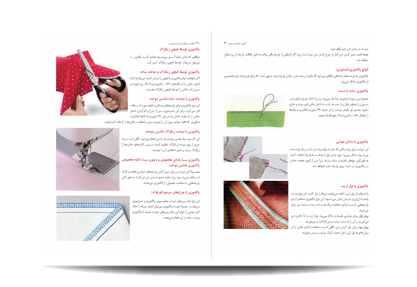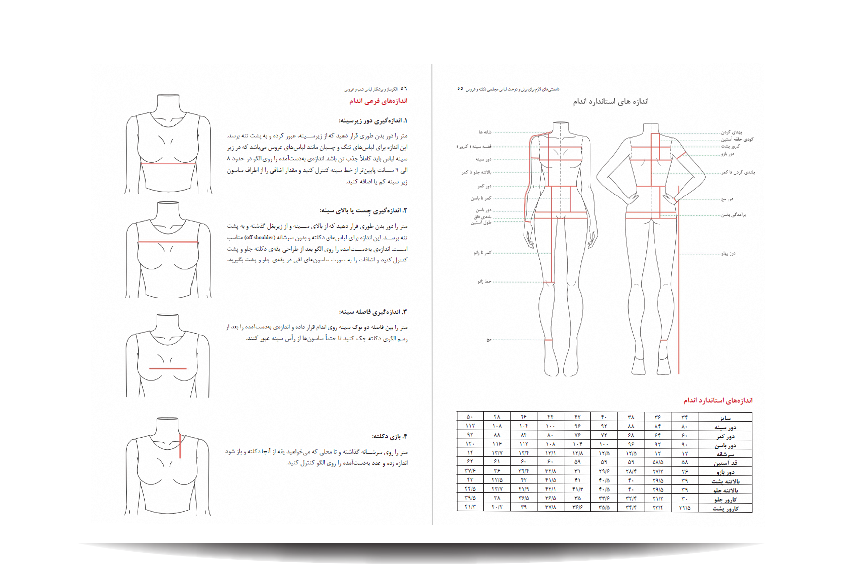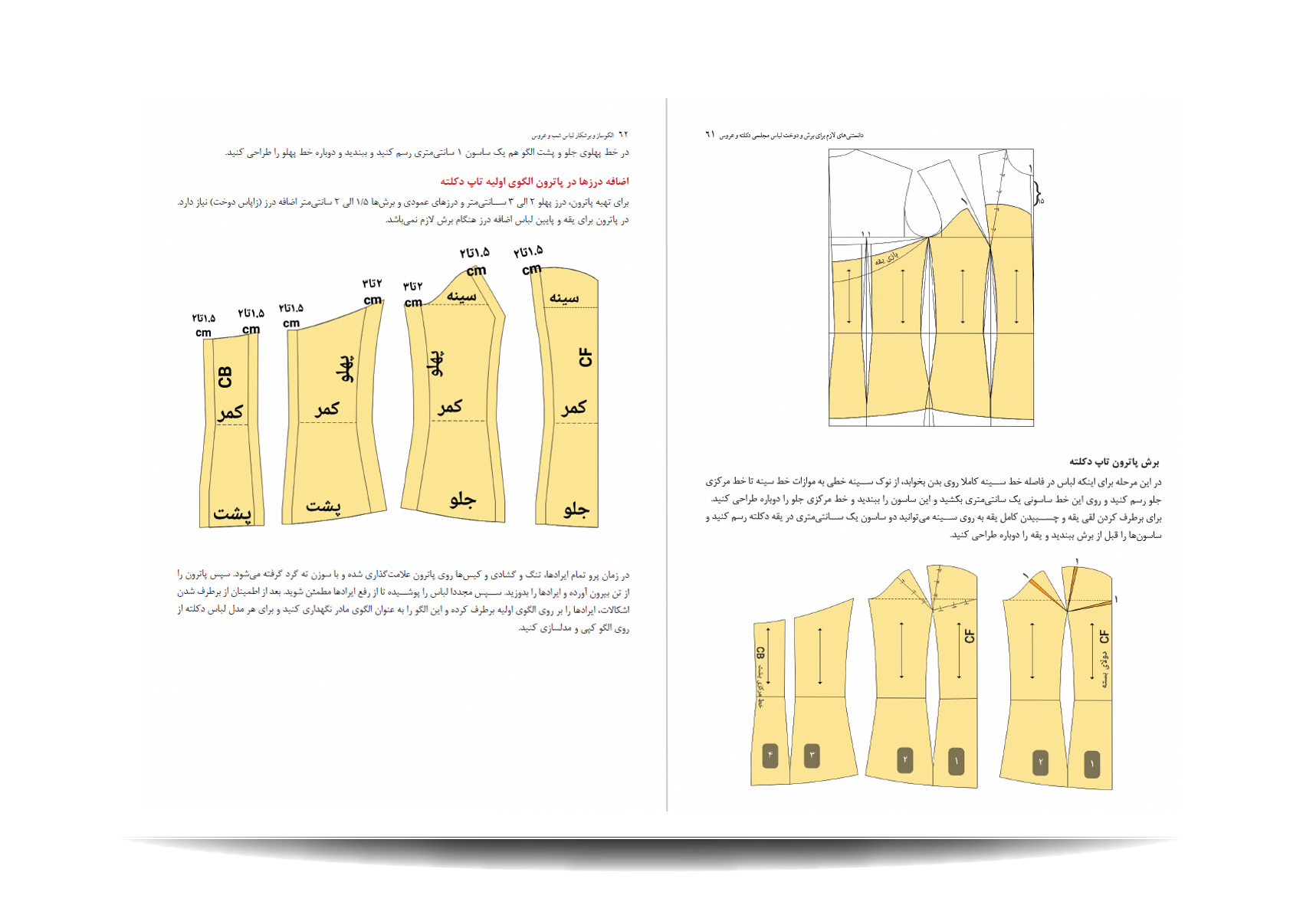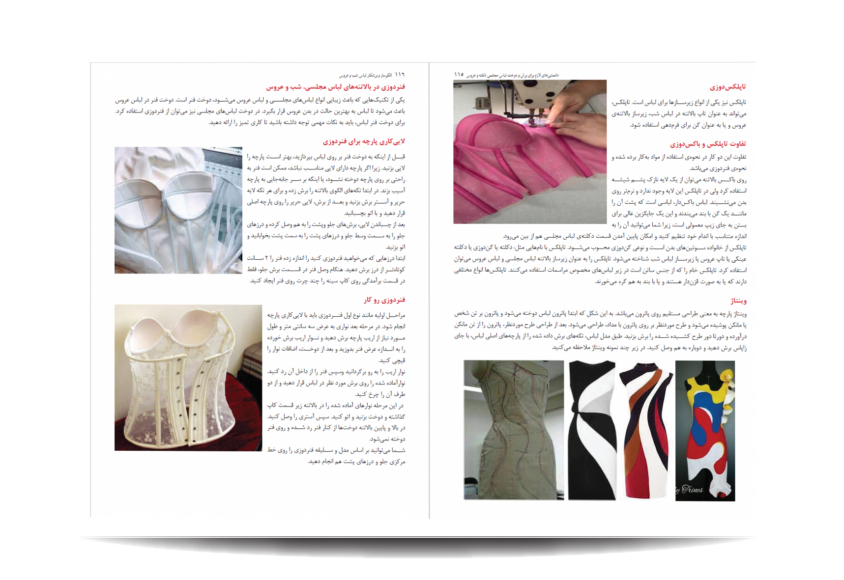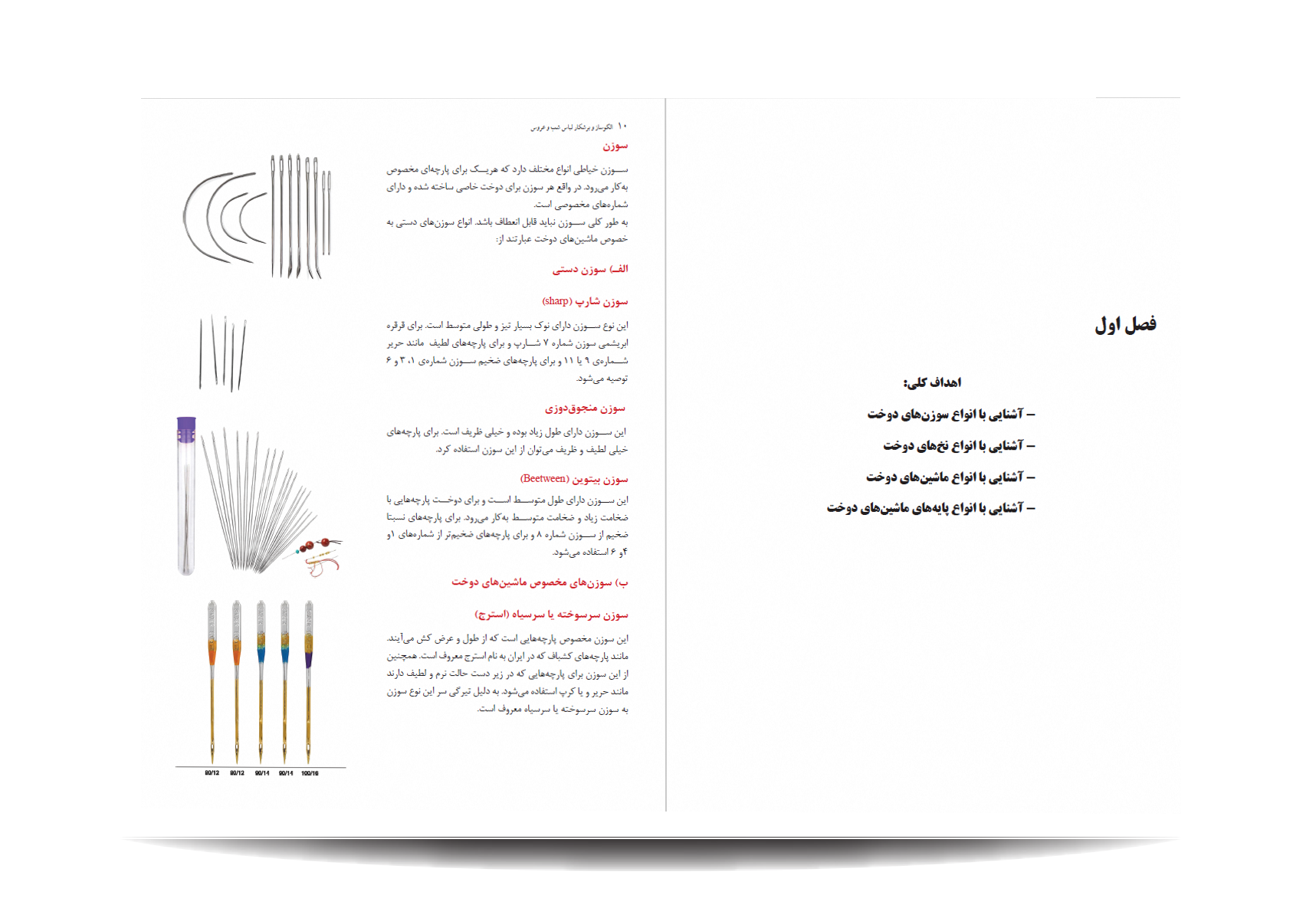 مباحث کتاب الگوساز و برشکار لباس شب و عروس: آشنایی با انواع سوزن-آشنایی با انواع نخ- دوخت-انواع ماشینهای دوخت-انواه مختلف اتو-بالشتکهای مخصوص اتو-لایی چسب و انواع آن در خیاطی-انواع قیچی-وسایل اندازهگیری-وسایل انتقال الگو روی پارچه-انواع پارچه و نحوه برش آنها-انواع دوخت اولیه-انواع پاکدوزی (لبه دوزی)-انواع پس دوزی (تودوزی)-طریقهی علامتگذاری دکمه-اندازههای طول جادکمه-دوخت جادکمه-روش تهیه جادکمه بندینک پارچهای