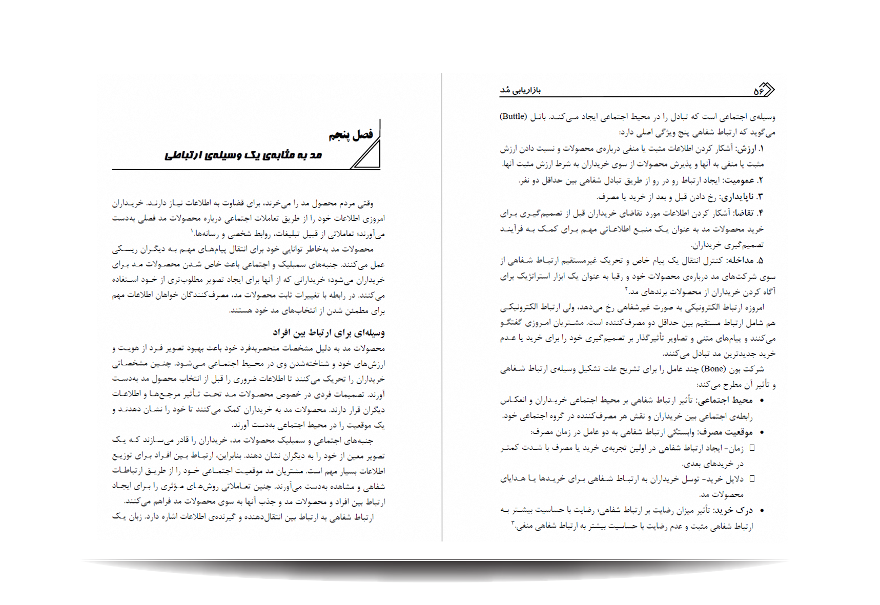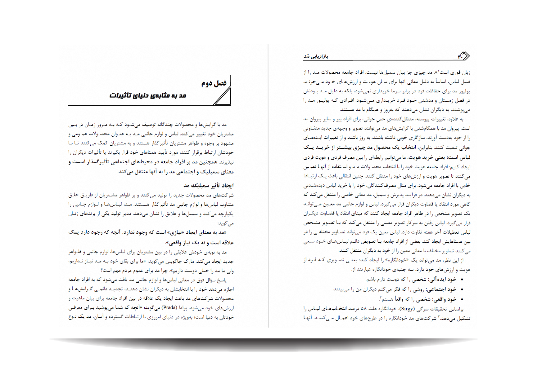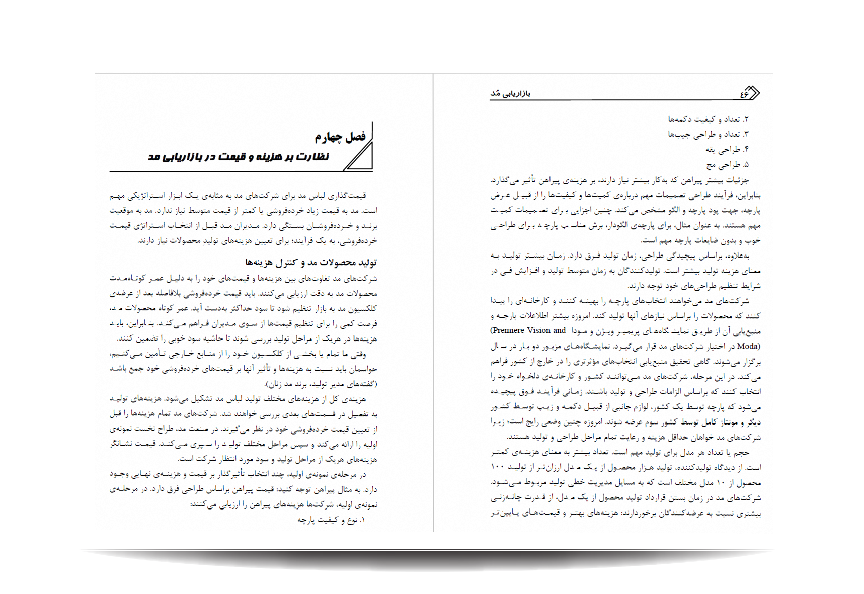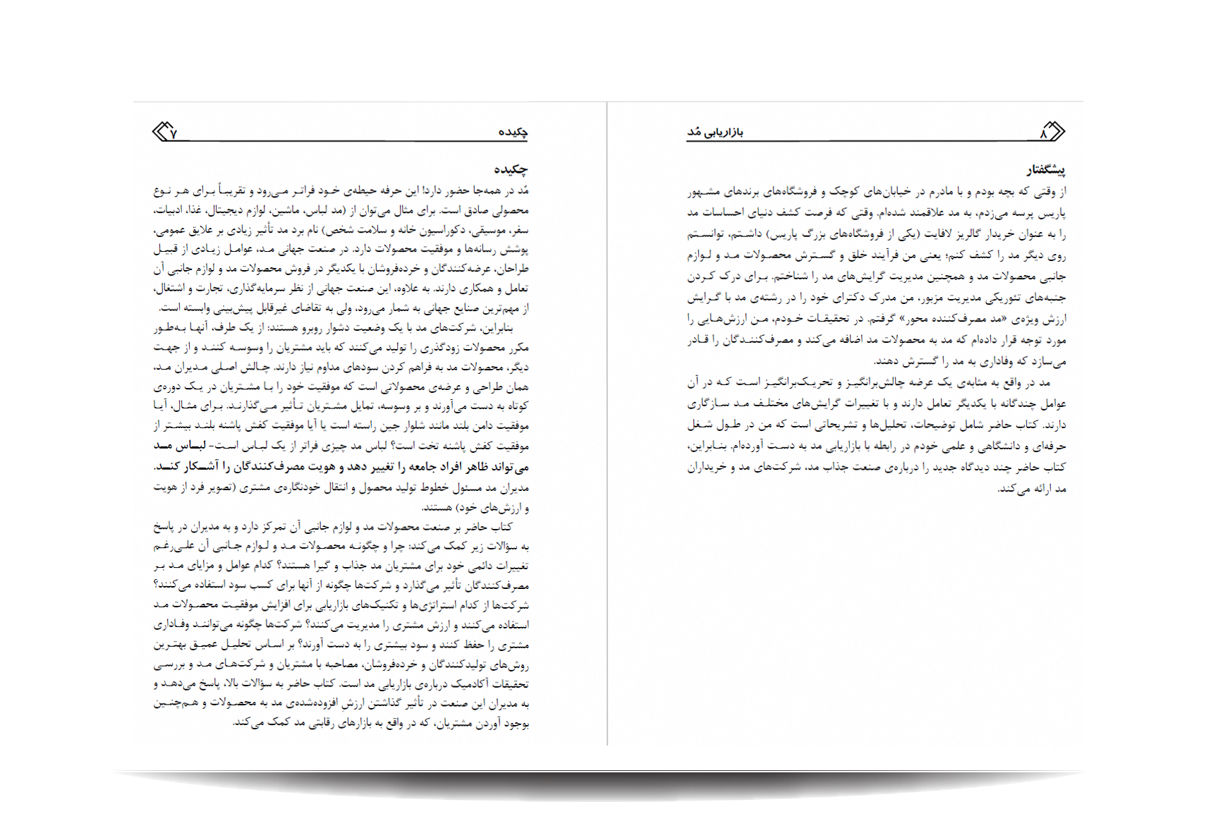 کتاب بازاریابی مد به مدیران براساس آخرین تحقیقات بازاریابی مد، دیدگاههای شرکت مد، بهترین روشها و الگوها و مصاحبه با مصرفکنندگان مد، در تاثیرگذاشتن بر ارزش افزوده مد به محصولات و خلق مشتریان وفادار در بازار رقابتی مد کمک میکند.مباحث کتاب بازاریابی مد بیشتر بفروشید: مد به مثابه ی امیپراطوری وسوسه -مد به مثابه ی دنیای تاثیرات-مد و محصولات متنوع مد-نظارت بر هزینه و قیمت در بازاریابی مد-مد مثابه یک وسیله ی ارتباطی-مدیریت کانال های توزیع و بهبود تاثیرات مد-اهرم ارزش ویژه ی مد به مثابه یک مزیت مطلق